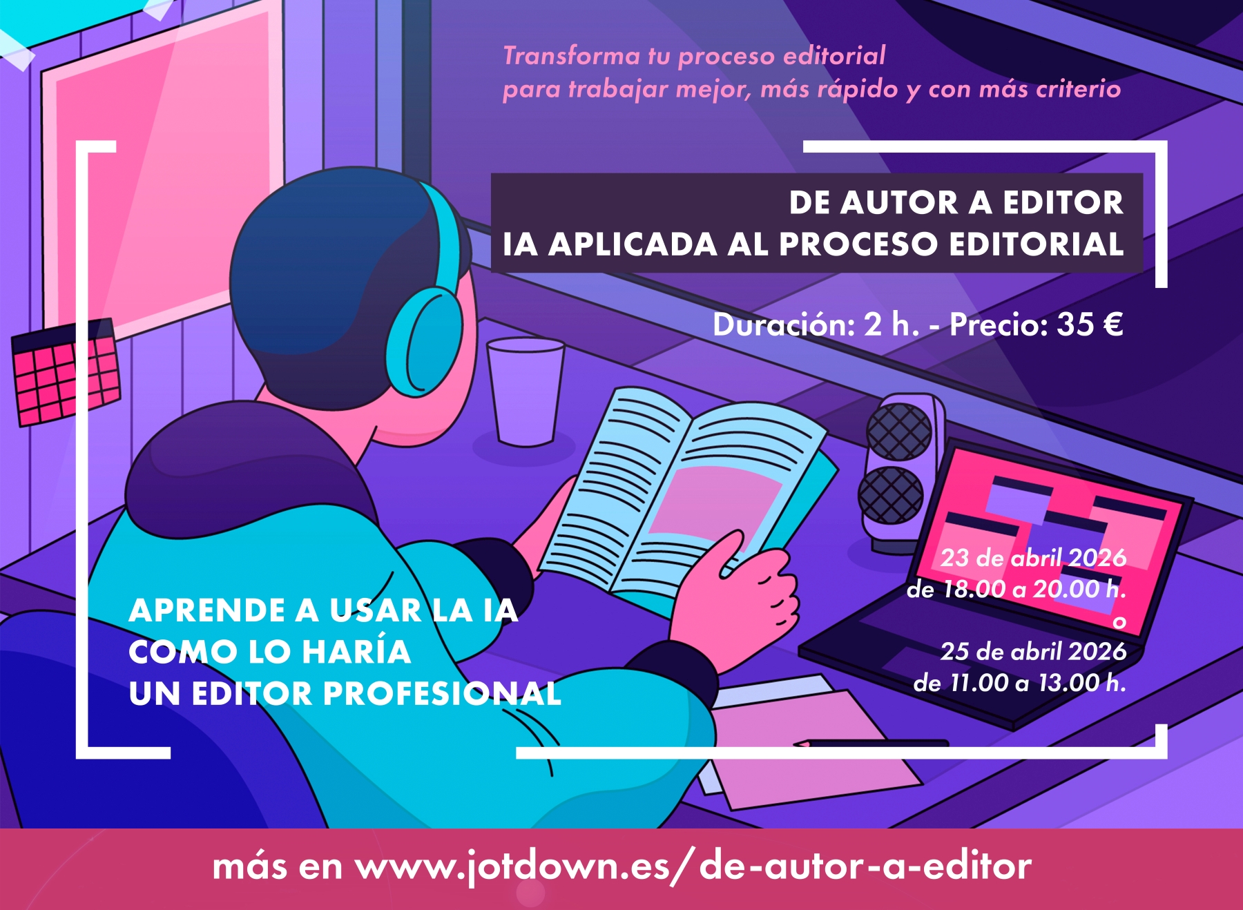 El taller está dirigido a editores, correctores, maquetadores y profesionales del sector editorial que quieran integrar la IA en su día a día sin perder el criterio ni la autoría sobre el proceso. No se trata de sustituir al editor, sino de dotarlo de herramientas que multipliquen su capacidad de lectura crítica y su eficiencia operativa.